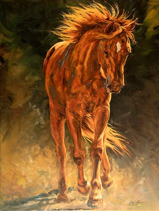This show centers around the flow of life in the natural world, illuminated by the slanting light at the edges of dawn and dusk. The paintings celebrate life’s small wonders; the fleeting instance of a hummingbird, the rushing sound of a waterfall, the sweet smell of spring grass bending to the hooves of a new foal.