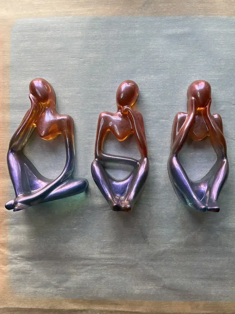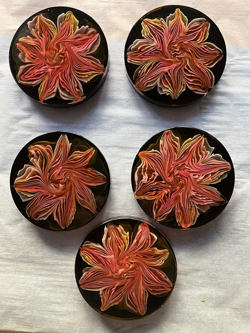 The magic with this art form is in the process of creating and watching as each piece is unique in the final form. No two pieces are alike! While I’m creating; pouring the resin mixture into the mold, then adding the alcohol ink, creating designs all with the hope that when it’s cured (hardened) 6 to 12 hours later…or more, I will have something beautiful. When the piece is removed from the mold the design is underneath the top portion. It’s always a surprise!