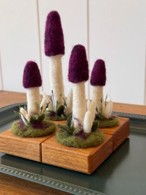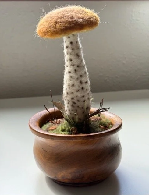 Needle felting is the art of using barbed needles to sculpt wool roving into an infinite variety of shapes and forms. Owl Song Feltery creates botanicals out of wool. Owl Song Feltery was started by Mia Simonsen in 2024 and is located in Cheney,Wa. Cactus and succulents were Mia’s first botanicals of choice, and she has since added mushrooms and other fungi to her feltery. Growing up in North Idaho gave Mia plenty of chances to fall in love with the outdoors, a passion that continues to influence her art today. She has long been obsessed with growing things and has been an avid gardener for the past 30 years and a florist for the past 6 years. Needle felting allows Mia to design with botanicals year-round. From picking the shape and colors of a new project to finding just the right vintage container to showcase the finished form, the entire process offers her endless possibilities. Mia also values the joy and whimsy “feltanicals” bring to this world. Yes, that’s a word she made up to describe her art! Her realistic sculptures bring delight in a way unique to Owl Song Feltery.