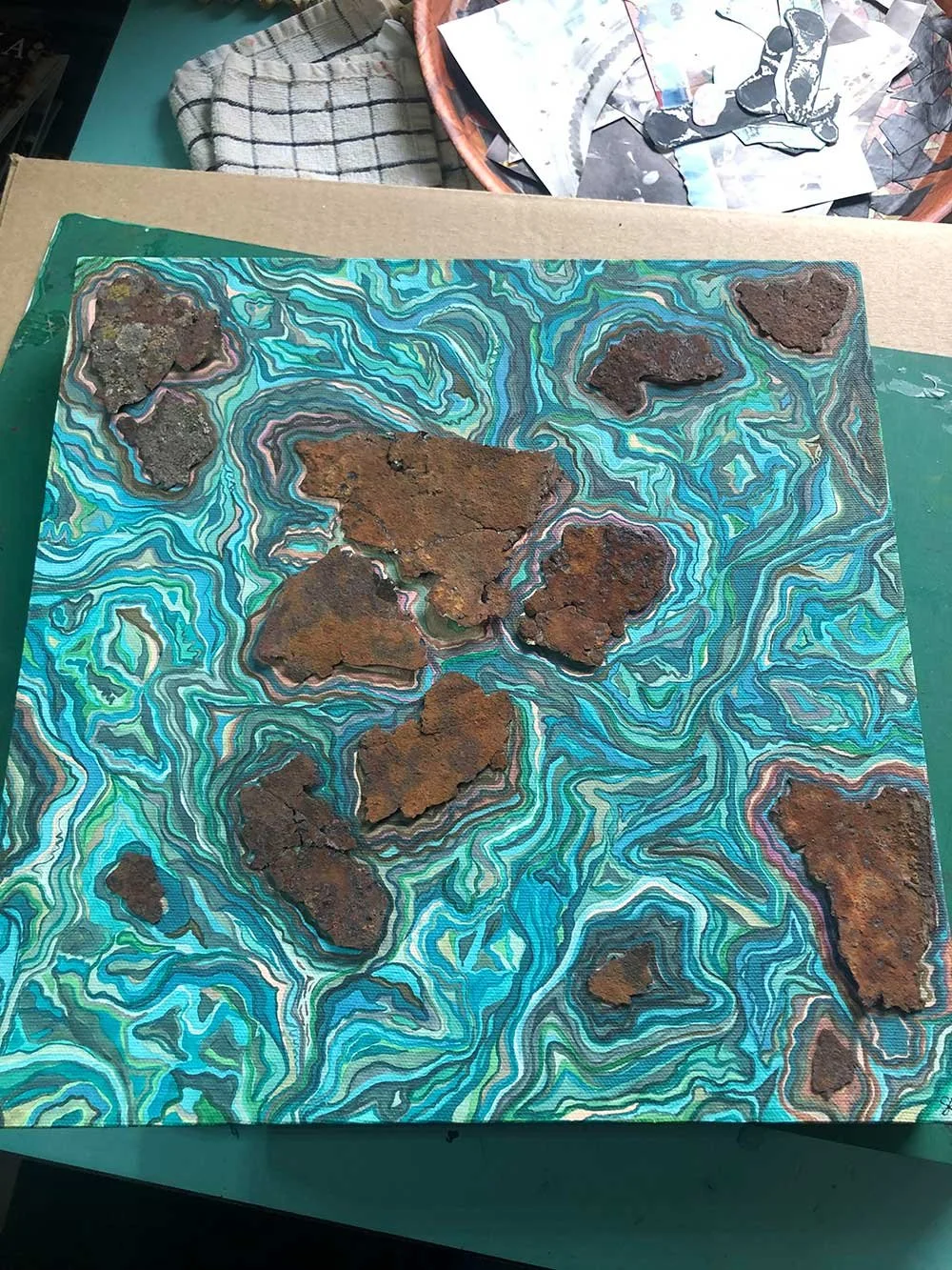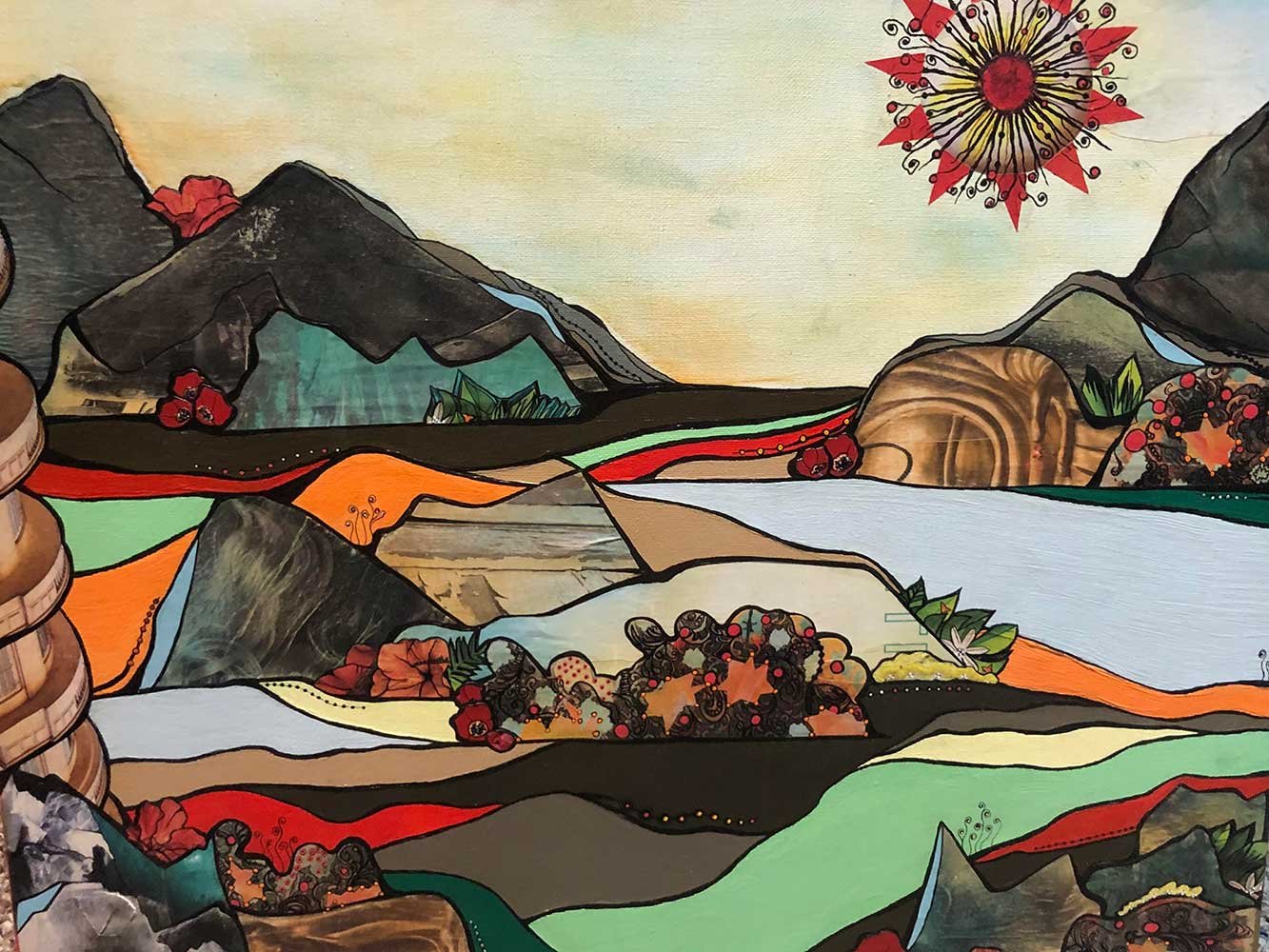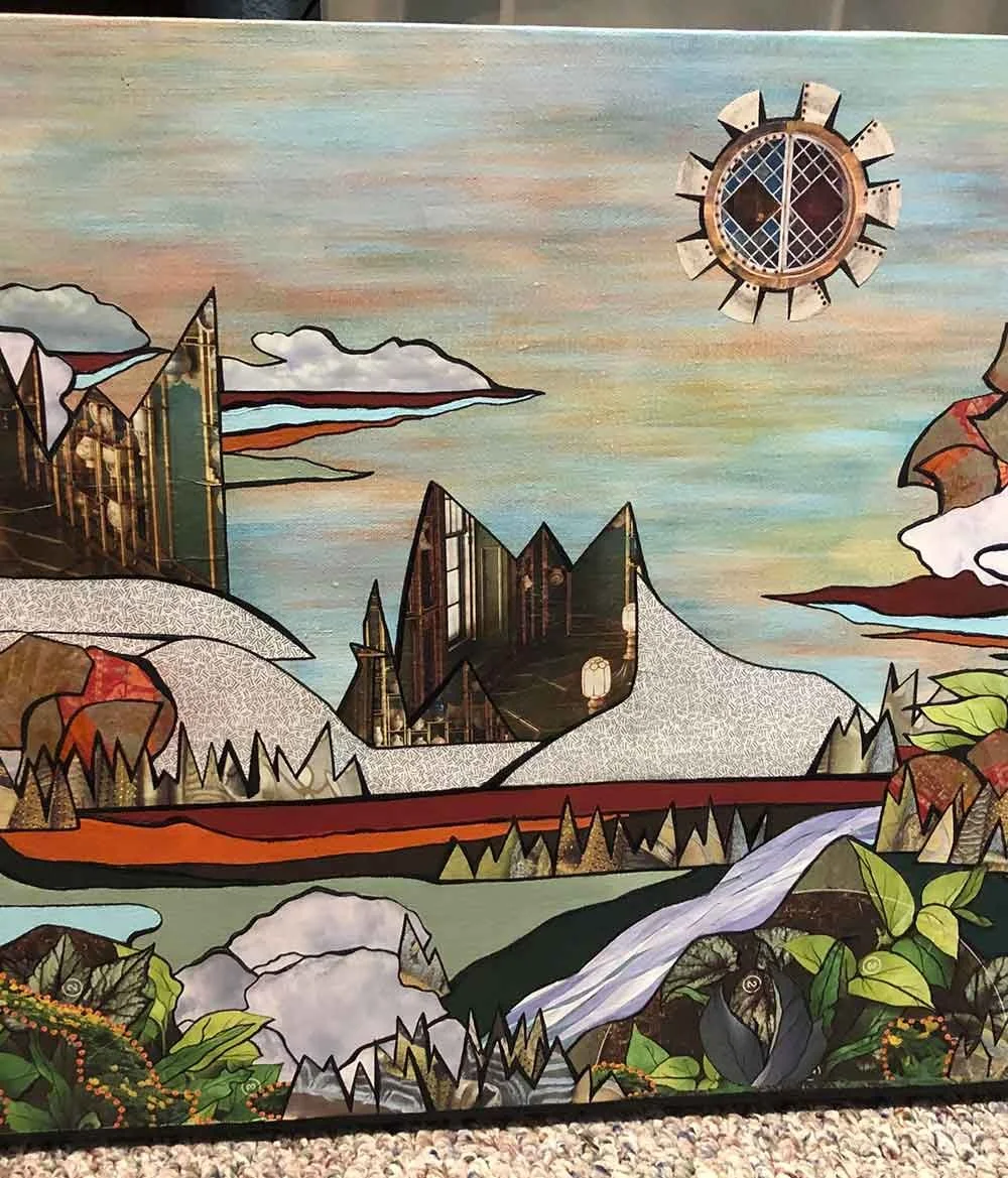 I am currently exploring abstract mixed media landscapes. These landscapes are a creative challenge for me! I find interesting images and materials and piece them together in unique ways to create clean, beautiful, and original pieces. I try to reveal the beautiful qualities and hidden potential of my materials—some of them long forgotten and headed for a landfill—by elevating them through color, composition, and my own creative imagination. Through them, I create distant worlds that now exist for others to enjoy. I hope you find my artwork fun and interesting!