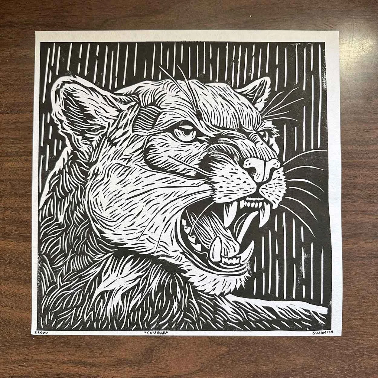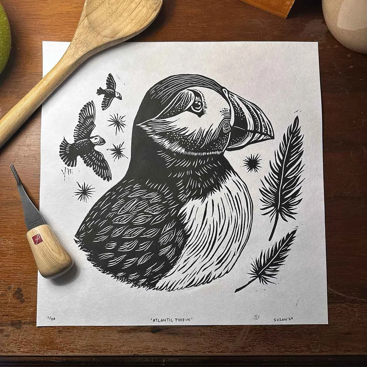 Hi there! My name is Suzan LeDoux and I am the artist behind Craft & Textile! I grew up in North East Washington, and after a few years of moving around we settled in Kettle Falls, Washington. Growing up around creative women, I always wondered what would be my niche. I have tried so many types of art expression, but printmaking was the one that finally took hold. Specifically linocut printmaking, which is a form of relief printing. An image is cut or gouged from a sheet of linoleum, which is softer and easier to carve than wood. The surface is inked and paper laid on top, with printing accomplished either by rubbing manually with a spoon or similar tool, or on a printing press. As a printmaker, my work is primarily inspired by the natural world and the beauty of flora and fauna. Through carving I aim to capture the textures we observe in nature, and the intricate details that often go unnoticed.